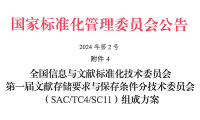 全國(guó)信息與文獻(xiàn)標(biāo)準(zhǔn)化技術(shù)委員會(huì) 第一屆文獻(xiàn)存儲(chǔ)要求與保存條件分技術(shù)委員會(huì)正式成立據(jù)國(guó)家標(biāo)準(zhǔn)化管理委員...